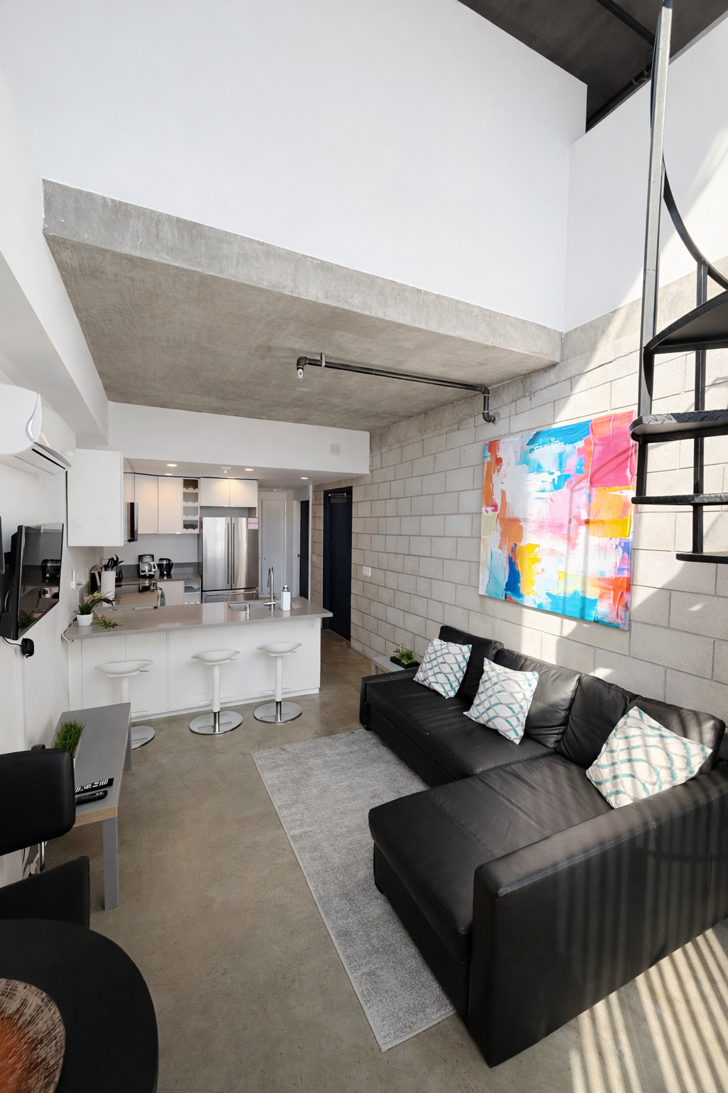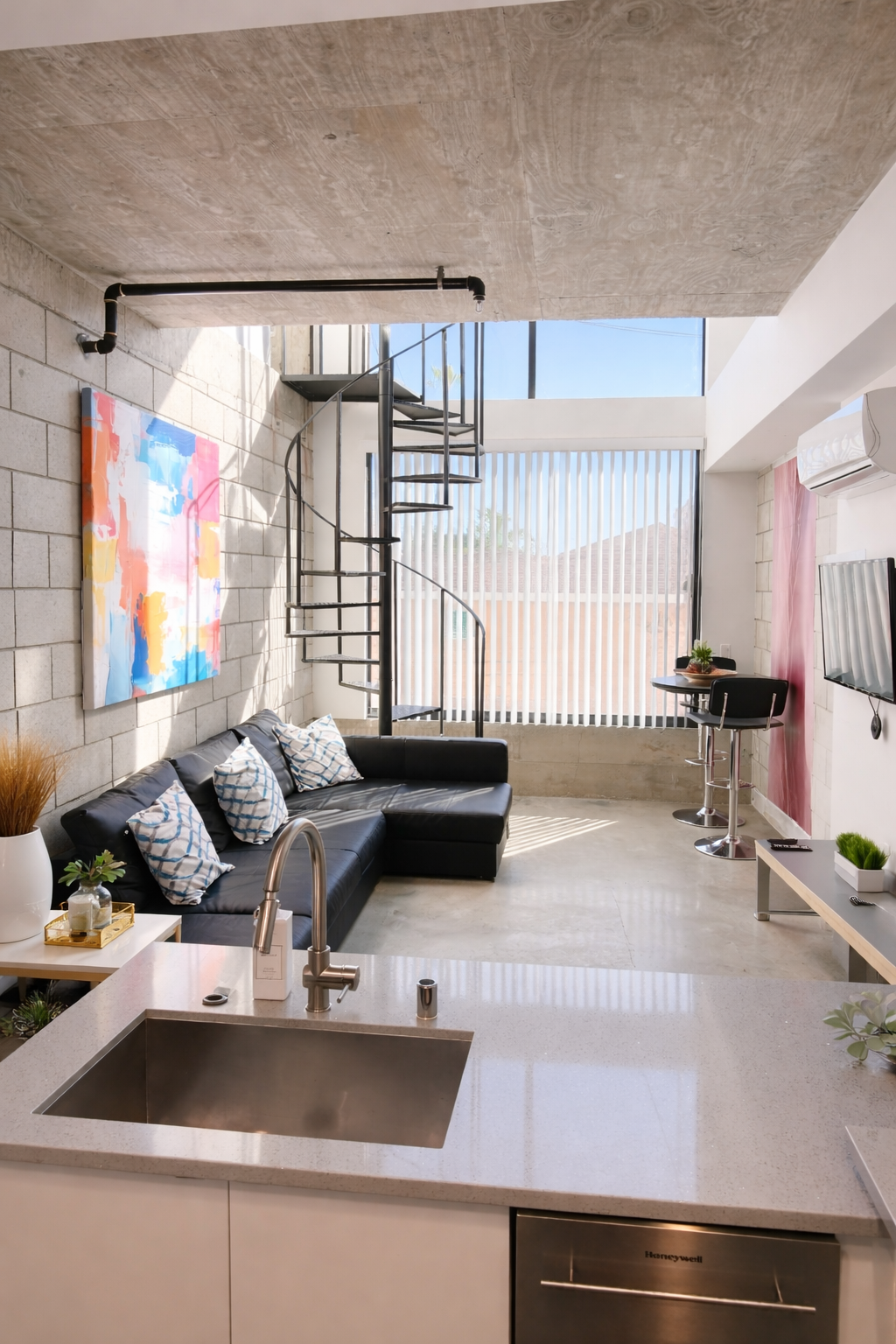 Enjoy this stylish 2 bedroom apartment. The modern ambiance makes this a perfect home base to explore. Walking distance to restaurants, breweries etc you are in the heart of everything. ADA compliant parking spot, bathroom, Kitchen and downstairs bedroom (1 queen bed and a sofa bed) and living room (also sleeper sofa). The second bedroom is in the Loft Area (1 queen bed) and not ADA compliant. Due to steep stairs leading to the loft area, this unit is not suitable for small children.