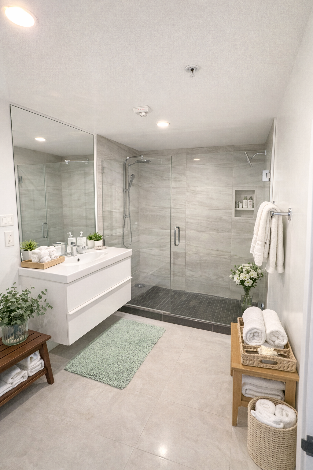 - There is no threshold or step between the shower and bathroom floor