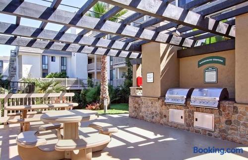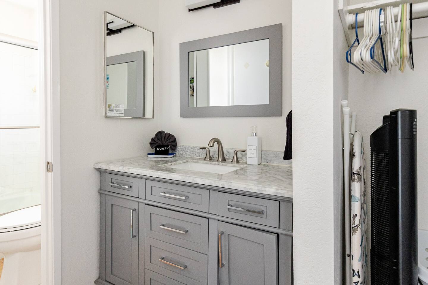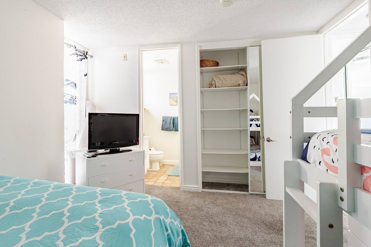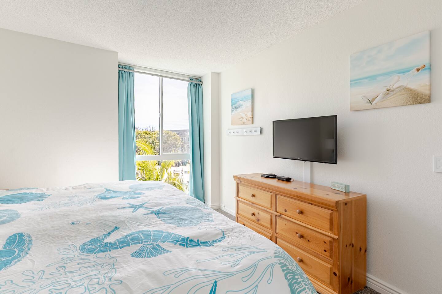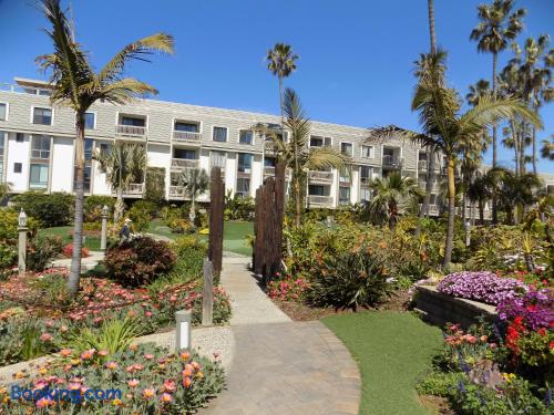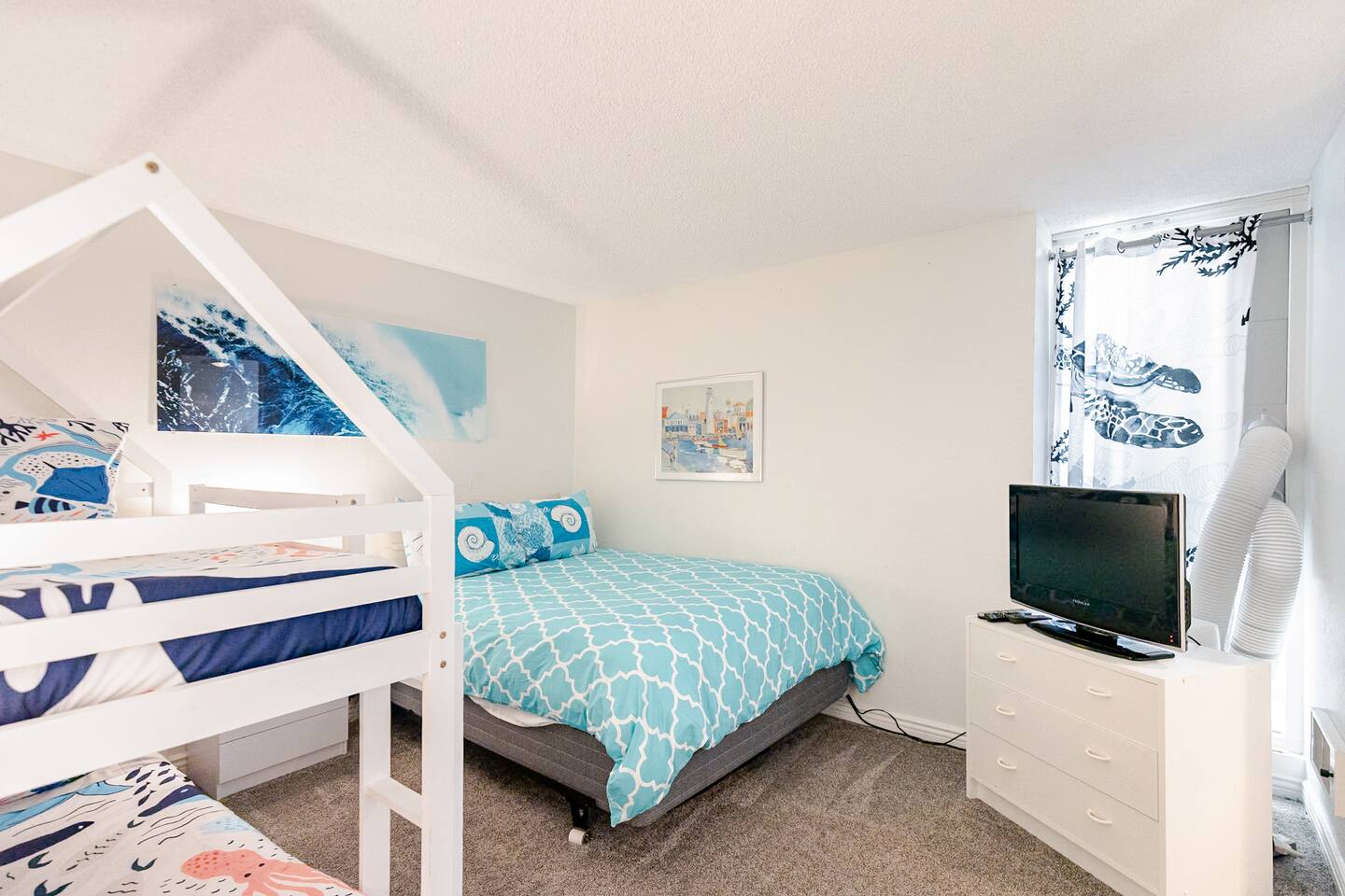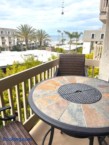 🛏 What You’ll Love ✅ Sleeps 6 comfortably: • 1 bedroom with King bed and attached bathroom • 1 bedroom with a queen bed and twin bunk bed with attached bathroom • sleeper sofa ✅ 2 huge year round heated pools ✅ 2 hot tubs ✅ Steps to the beach! ✅ Oceanview balcony and master bedroom ✅ Fully stocked kitchen—cook with ease ✅ Fast WiFi + Smart TV for streaming ✅ Air conditioning & heating for year-round comfort ✅ Early check-in/late check-out available (small fee, when available) 🌿 Beautifully tropical landscaped grounds 🍔 BBQ grill for fun cookouts Koi Pond (bring quarters to fee the fish and ducks) Minigolf course Game Room with Foosball, billiard and ping pong tables Sauna and Fitness Center 🚗 Guest Access • Full access to the entire apartment, private porch • Free assigned garage parking • Washer and Dryer in the building (coin-operated and shared) 📍 Location Highlights We're located in a safe, walkable neighborhood close to everything: • 👟 5 min Walk to Oceanside Harbor and 10 minutes to Oceanside Pier and Downtown Oceanside • 🚗 10 mins to Legoland and 20 minutes to the Safari Park Zoo... • 🌊 Right by a sandy kids friendly beach • 😊 Friendly community with a relaxed vibe Additional Notes • Early check-in/late check-out can be arranged in advance (small fee applies) • Perfect for families with kids—plenty of space and activities • Great for remote work with reliable WiFi