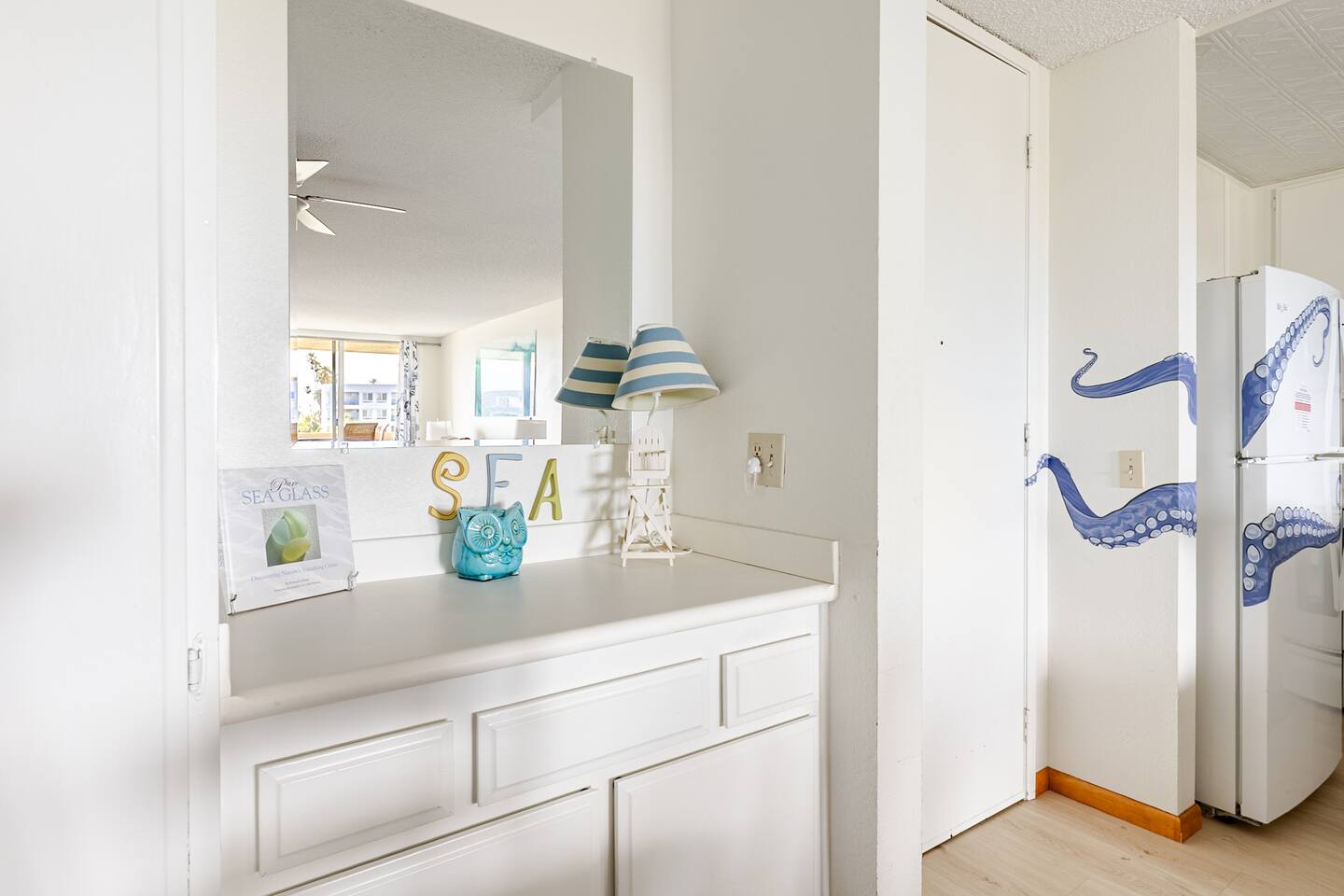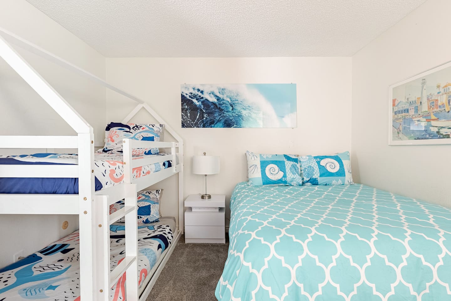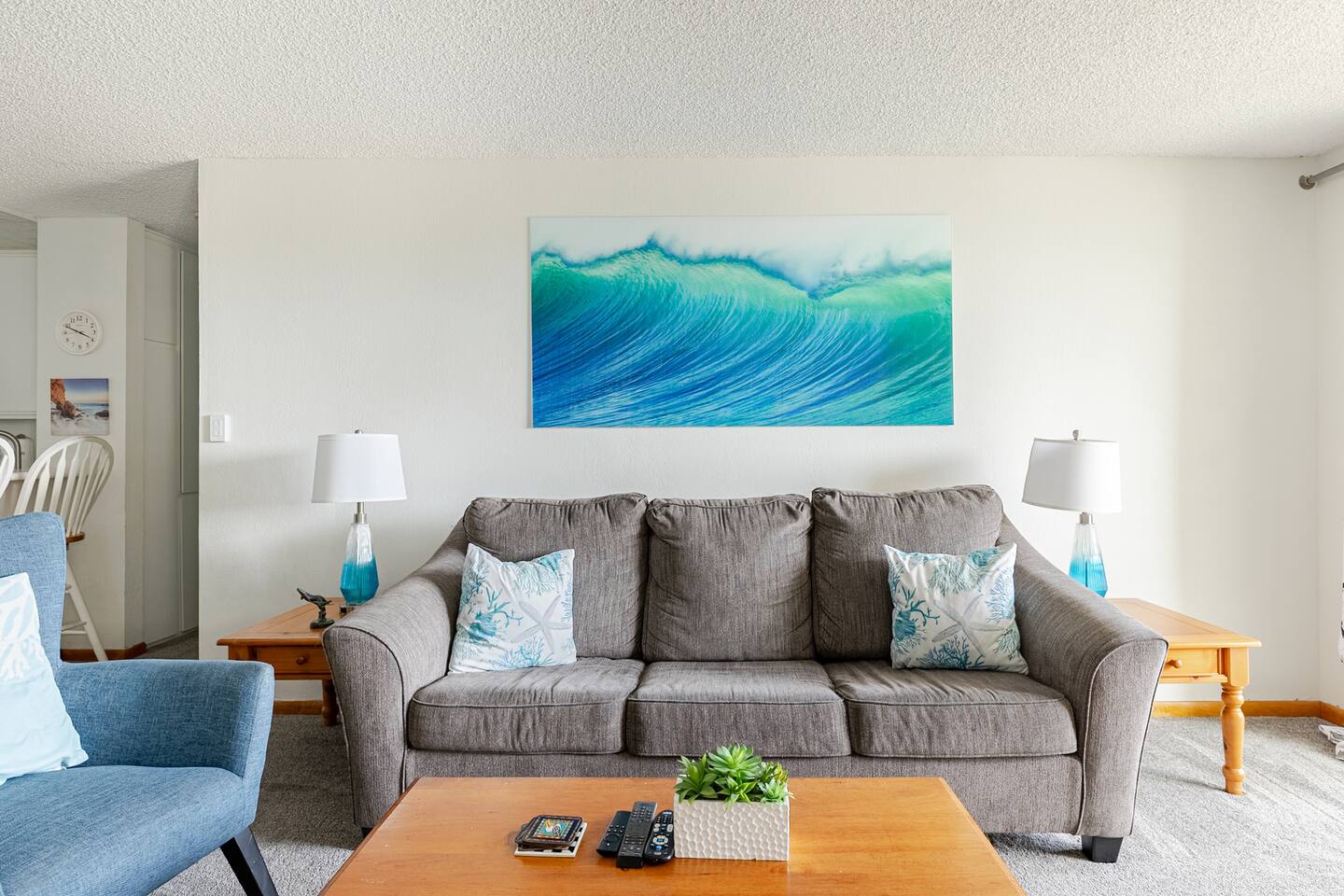 Enjoy the gorgeous ocean views, beautiful Pool, hot Tub and Beach at North Coast Village. This Oceanview condo will soothe you with shades of blue and turquoise as you gaze out at the sea. Relax on the balcony and listen to the sounds of the waves or enjoy the beach! The living area offers a comfortable sofa and 2 arm chairs. One bedroom has a king bed and ocean views and the other has a queen and a twin bunk bed. Both bedrooms have portable air condition units in the bedrooms.