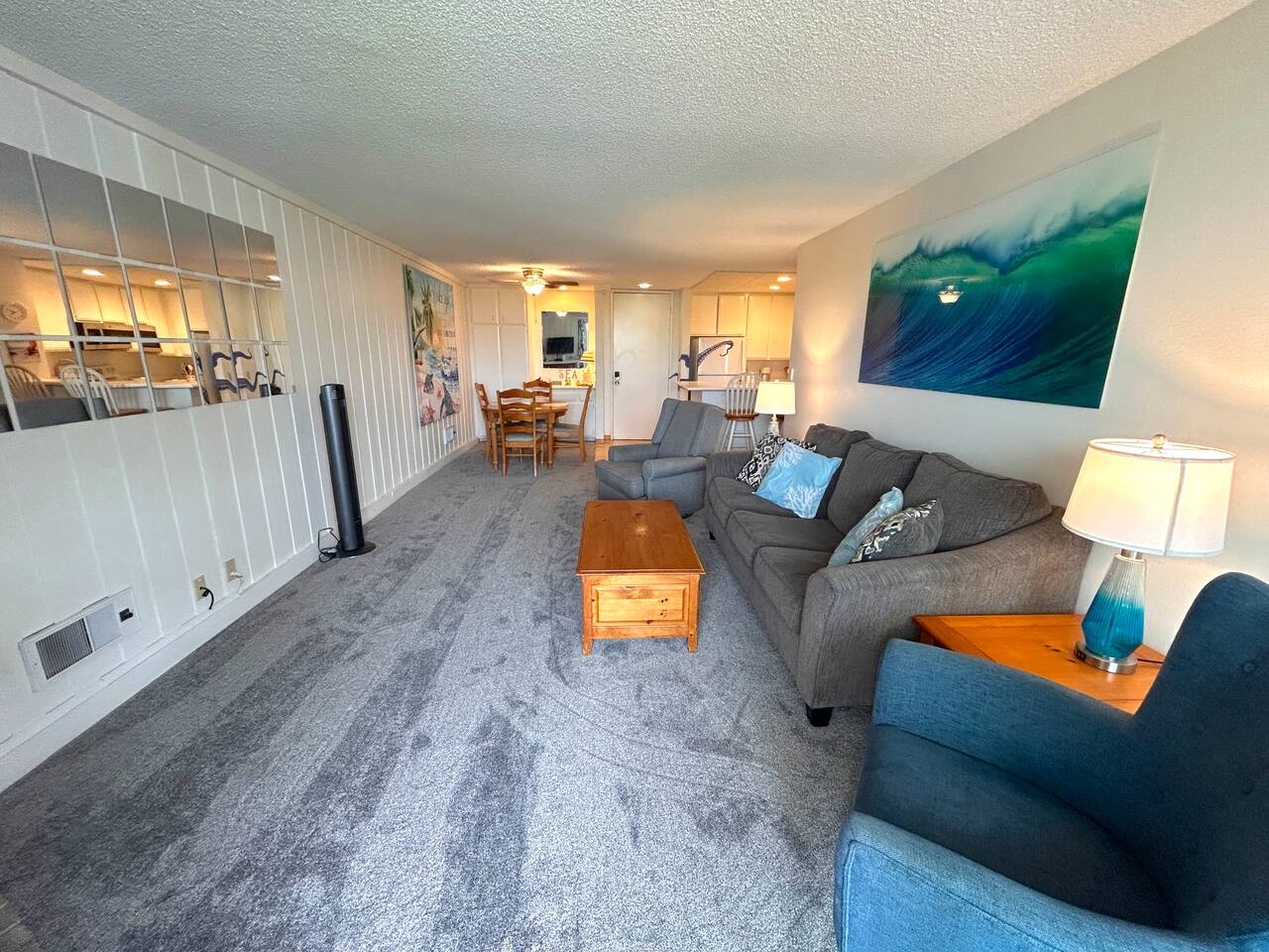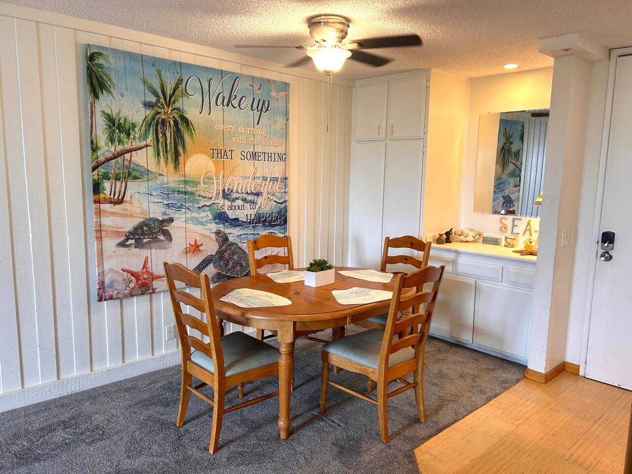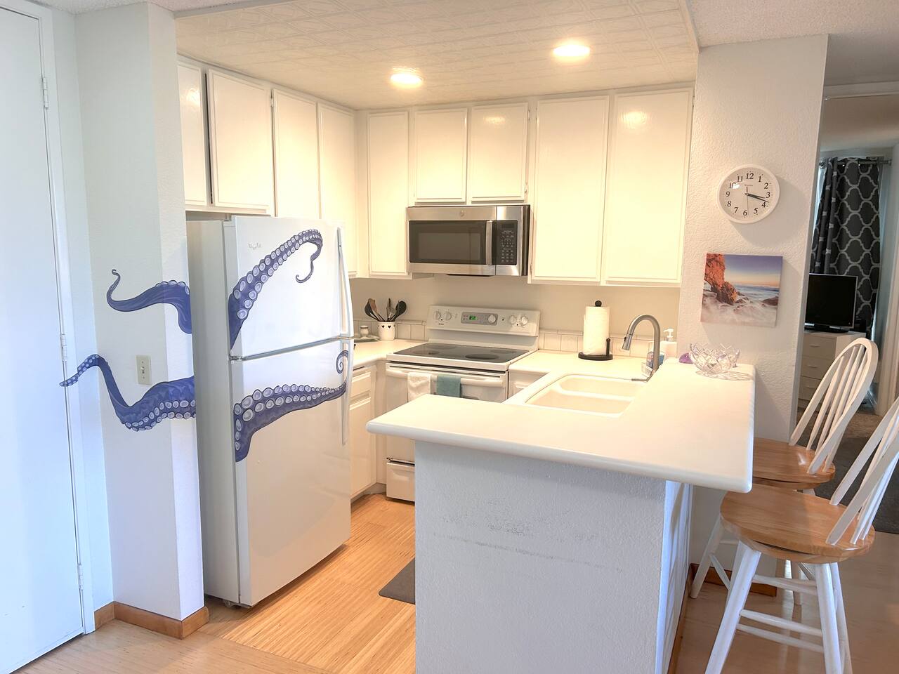 Enjoy the gorgeous ocean views, beautiful Pool, hot Tub and Beach at North Coast Village. This Oceanview condo will soothe you with shades of blue and turquoise as you gaze out at the sea. Relax on the balcony and listen to the sounds of the waves or enjoy the beach! The living area offers a comfortable sleeper sofa and 2 arm chairs. One bedroom has a king bed and ocean views and the other has a queen and a twin bunk bed. Both bedrooms have portable air condition units in the bedrooms.