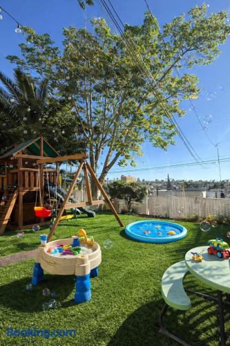 Viva San Diego was designed to be lively, colorful, and inviting, with its own California flavor. Lots of primary colors and fun patterns in the bedrooms and living area, plus new modern floors and design with lots of space for up to 8 people. The backyard includes a bbq area as well as a kids playset!